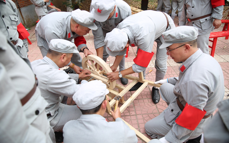 在一陣莊嚴(yán)的國歌聲中,“憶苦思甜”紅色印記拉開序幕,揮動我們手中的大刀,向革命先烈致敬;親手打一雙草鞋,體會紅軍戰(zhàn)士的艱苦生活;一斧一錘做一輛獨輪車,嘗嘗當(dāng)時的艱辛滋味……